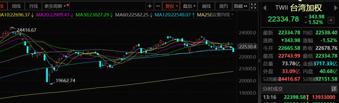中国台湾股市今天开平低盘后震荡,截至收盘,台湾加权指数下跌1.52%,收在最低点22334.78点,接连跌破季线与半年线,创11月1日以来新低。权重股普遍重挫,台积电下挫近1%,报收1000新台币整数大关,面临千金保卫战;鸿海重挫近3%;联发科也下跌超过2%,货柜三雄出现较大卖单压力。那么,究竟发生了什么?