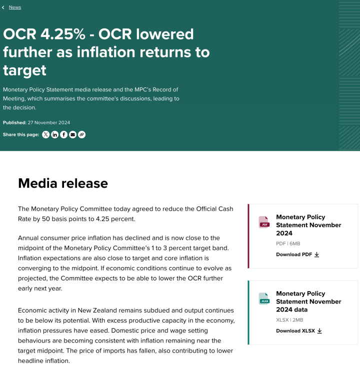 11月27日,新西兰央行宣布,降息50个基点,将基准利率从4.75%下调至4.25%。