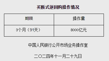 为维护银行体系流动性合理充裕,2024年11月人民银行以固定数量、利率招标、多重价位中标方式开展了8000亿元买断式逆回购操作。具体情况如下: