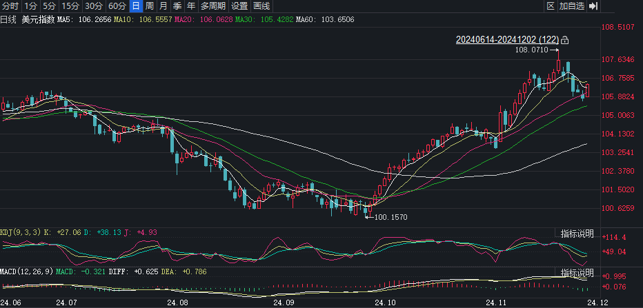 摩根士丹利预测,强势美元行情将在年底达到顶峰,并在2025年逐渐减弱。兴业研究在最新研报指出,美元汇率修复高估状况预计将持续一段时间,令非美货币迎来喘息。同为融资货币的日元汇率反弹,也将对人民币汇率形成牵引,预计12月人民币汇率稳中有升,这也符合岁末年初季节性规律。