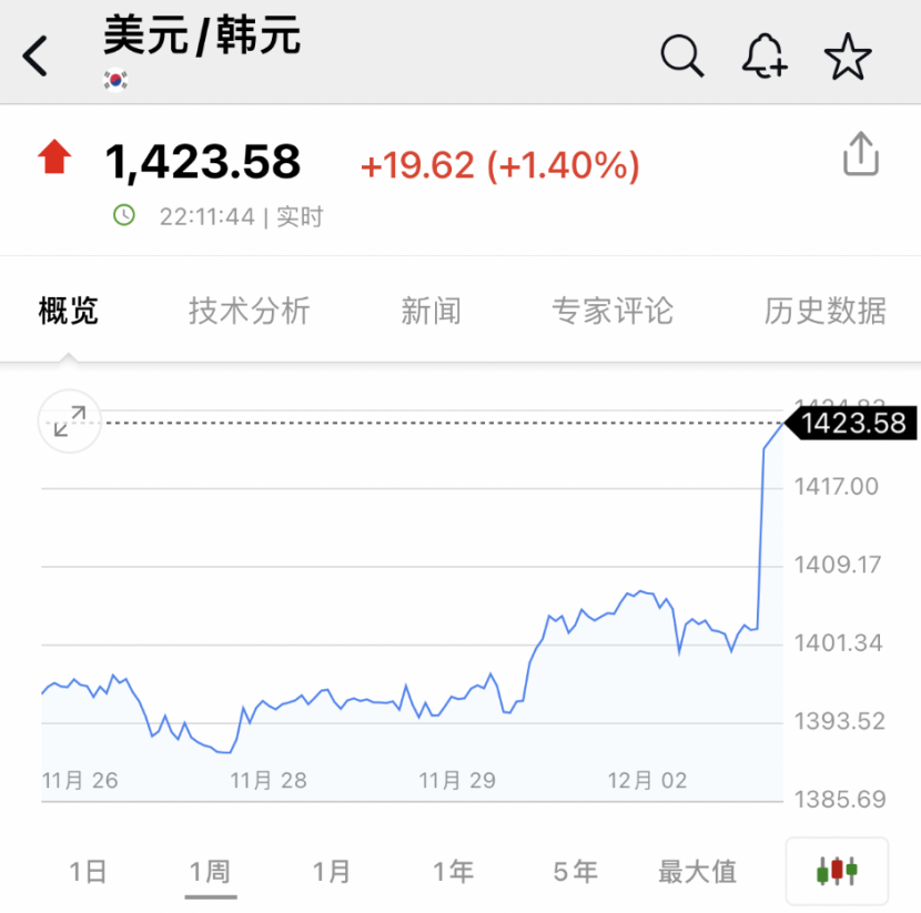 受此消息影响,韩国资产全线跳水。其中,韩元汇率大幅走低,美元兑韩元日内涨幅扩大至1.4%。