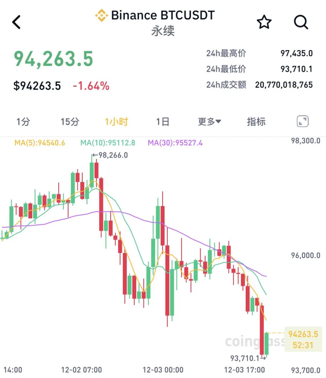 此前一度逼近10万美元/枚的比特币,近期持续调整,截至发稿,比特币已跌破95000美元/枚。