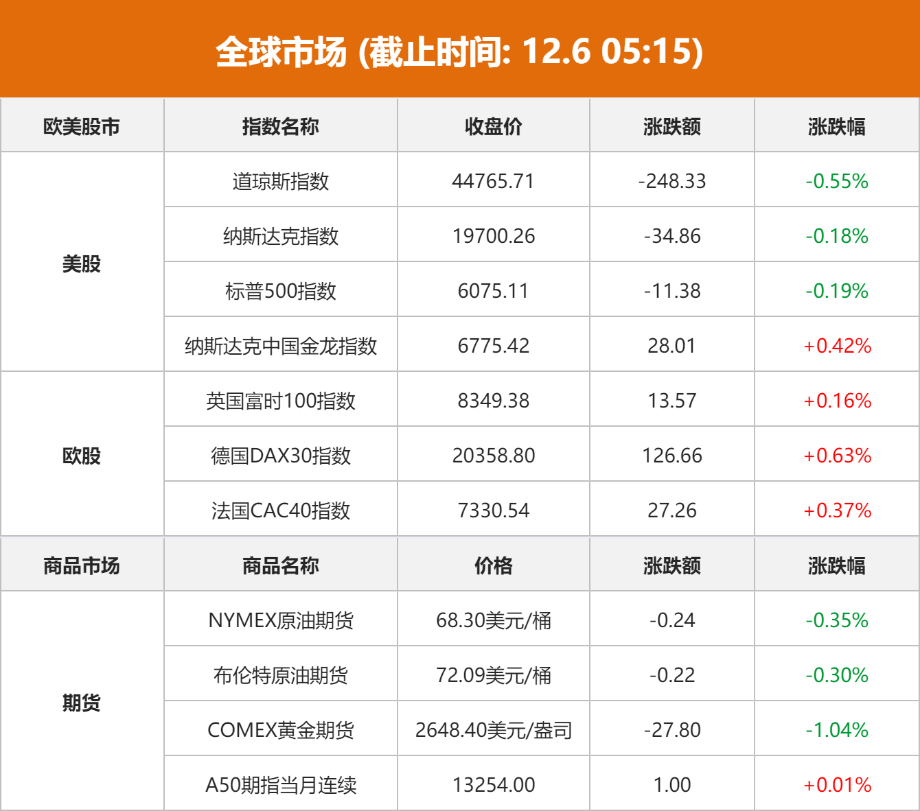 美股市场:美股三大指数集体收跌,截至当天收盘,道琼斯工业平均指数比前一交易日下跌248.33点,收于44765.71点,跌幅为0.55%;标准普尔500种股票指数下跌11.38点,收于6075.11点,跌幅为0.19%;纳斯达克综合指数下跌34.86点,收于19700.26点,跌幅为0.18%。