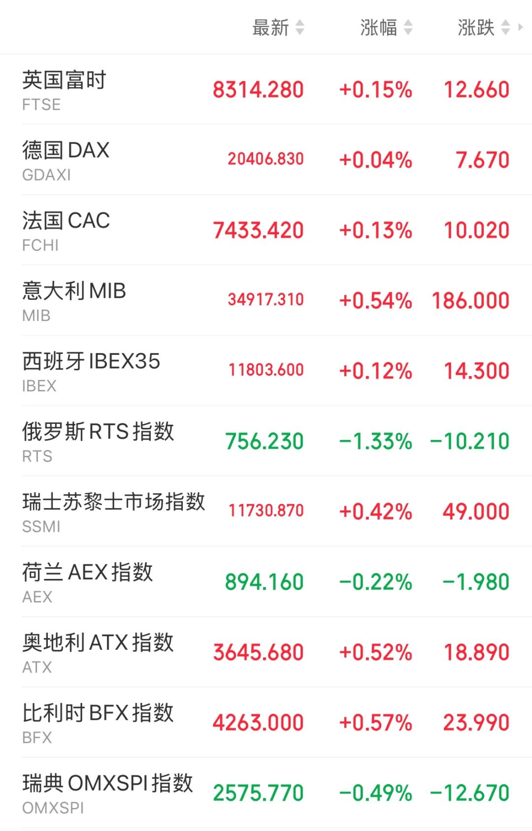 当天,欧洲主要股指集体上涨。截至发稿前,德国DAX指数涨0.04%,法国CAC40指数涨0.13%,英国富时100指数涨0.15%。