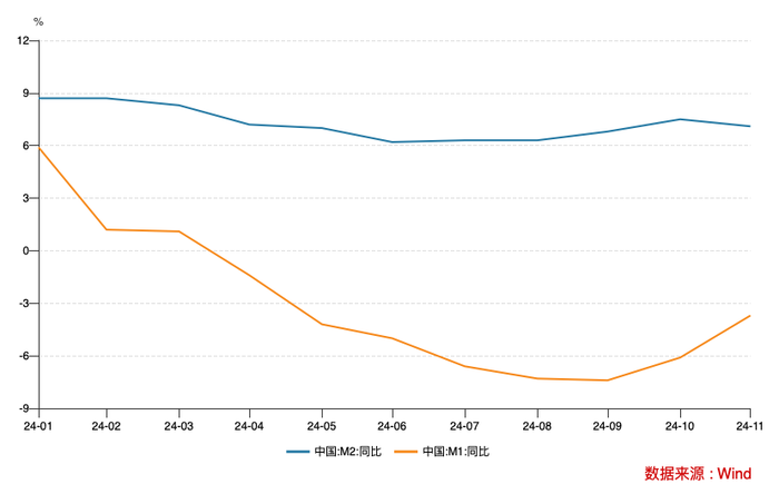 今年以来,M1增速持续回落,由1月的5.9%回落至9月的-7.4%,引起市场广泛关注,10月则回升至-6.1%。央行数据显示,11月M1余额65.09万亿元,同比下降3.7%。