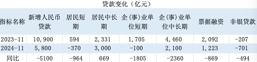信贷方面,央行数据显示,11月新增人民币贷款5800亿,相比去年同期少增5100亿元,主要受到地方债置换、贷款核销影响。