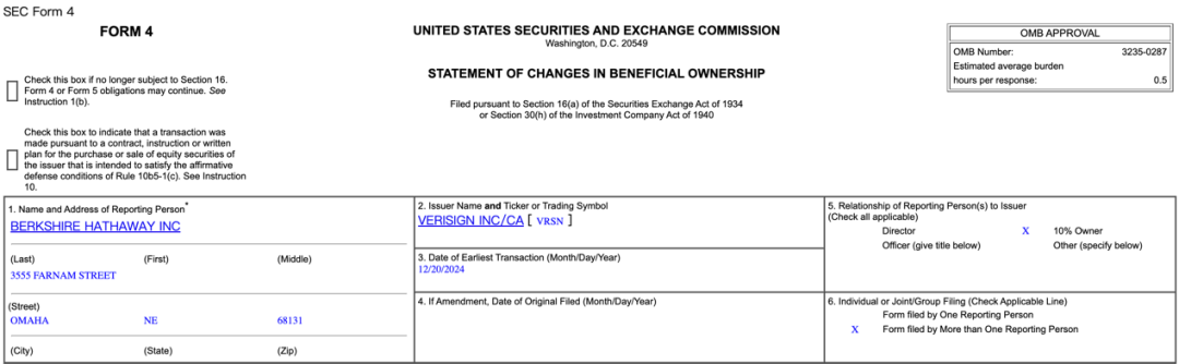 (伯克希尔·哈撒韦增持VeriSign,Form4文件。来源:SEC)