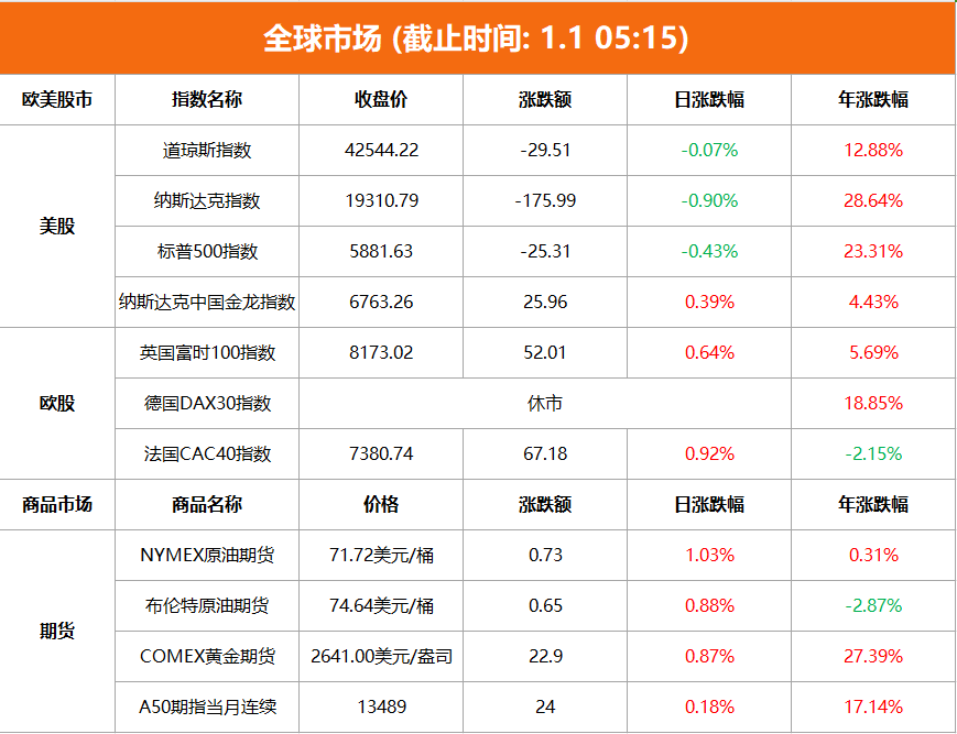 美股市场:美股三大指数集体收跌,纳指跌近1%,截至当天收盘,道琼斯工业平均指数比前一交易日下跌29.51点,收于42544.22点,跌幅为0.07%,2024全年累计涨幅达到12.88%;标准普尔500种股票指数下跌25.31点,收于5881.63点,跌幅为0.43%,2024全年累计涨幅达到23.31%;纳斯达克综合指数下跌175.99点,收于19310.79点,跌幅为0.90%,2024全年累计涨幅达到28.64%。