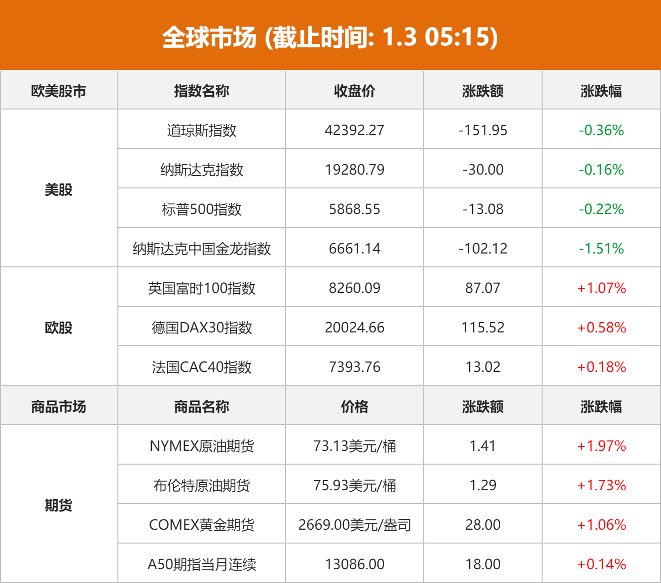 商品市场:国际油价上涨。纽约商品交易所2025年2月交货的轻质原油期货价格上涨1.41美元,收于每桶73.13美元,涨幅为1.97%;3月交货的伦敦布伦特原油期货价格上涨1.29美元,收于每桶75.93美元,涨幅为1.73%。国际金价上涨,COMEX黄金期货上涨28.00美元,涨幅1.06%,报2669.00美元/盎司。