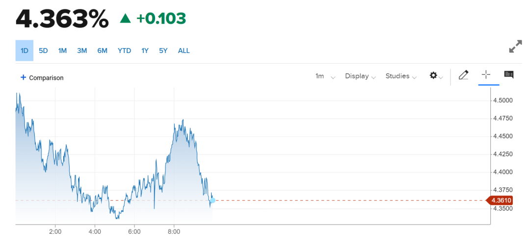 更引发市场关注的是美债,被誉为“资产之锚”“避险之王”10年期美债连续3个交易日被抛售,今日,10年期美国国债收益率一度攀升到4.45%XM外汇官网,与4月4日盘中3.86%最低收益率相比,上行约65基点。
